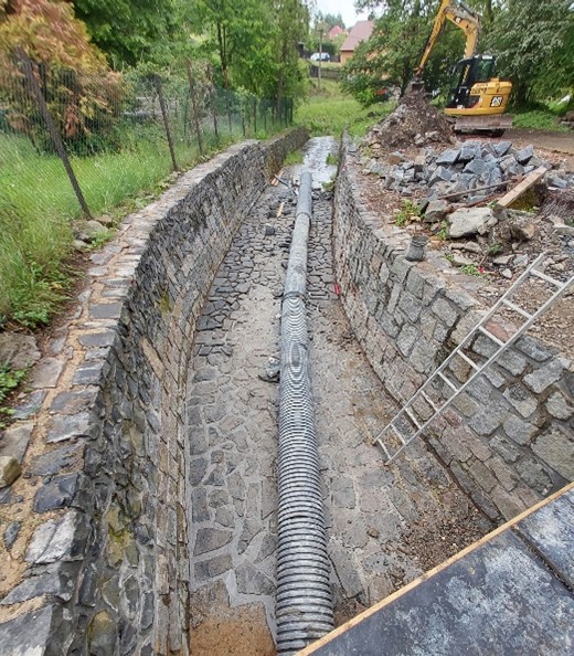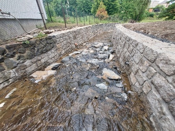 V rámci rekonstrukčních prací se jednalo o opravu stávajícího opevněného úseku koryta vodního toku poškozeného povodní. Součástí stavby byly opravy pomístně porušených dnových dlažeb jejich předlážděním, dále pak byl v nejvíce porušeném úseku vybudován nový skluz, který byl shora a zdola zajištěn betonovými pasy. Součástí skluzu byla oprava opěrné zdi v pravém břehu toku. V rámci stavby byla provedena oprava části opěrné zdi v levém břehu. Stávající poškozená konstrukce byla v požadované míře odstraněna a nahrazena novou.